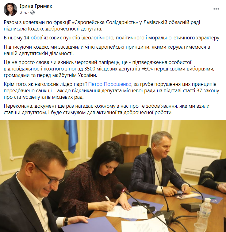 «Разом з колегами по фракції «Європейська Солідарність» у Львівській обласній раді підписала Кодекс доброчесності депутата.