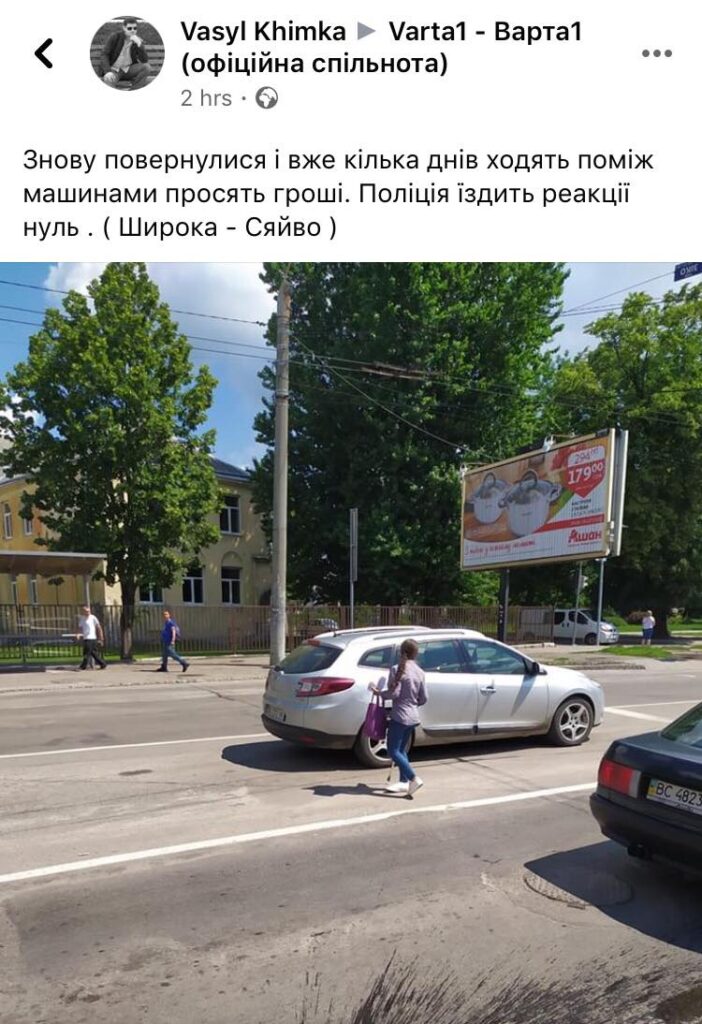 “Знову повернулися і вже кілька днів ходять поміж машинами просять гроші… Поліція їздить – реакції нуль”, – йдеться у дописі.