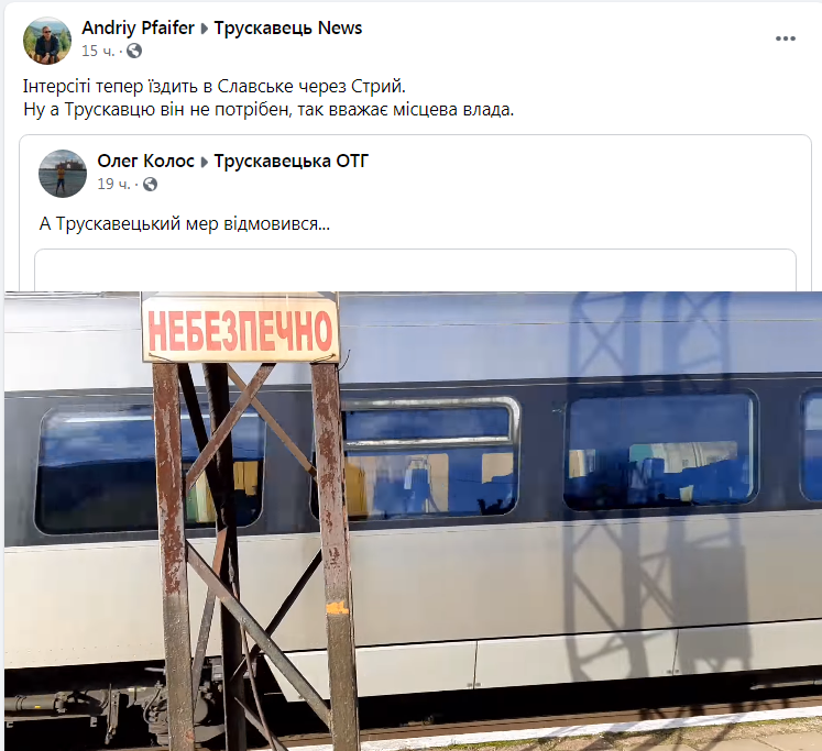 «Інтерсіті тепер їздить в Славське через Стрий. Ну а Трускавцю він не потрібен, так вважає місцева влада», – зазначив у коментарі Andriy Pfaifer.