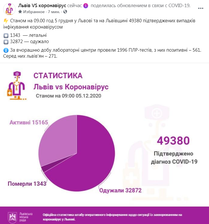 У Львівській області, станом на 09.00 год 5 грудня, у Львові та на Львівщині 49380 підтверджених випадків інфікування коронавірусом, 1343 — летальні, 32872 — одужало.