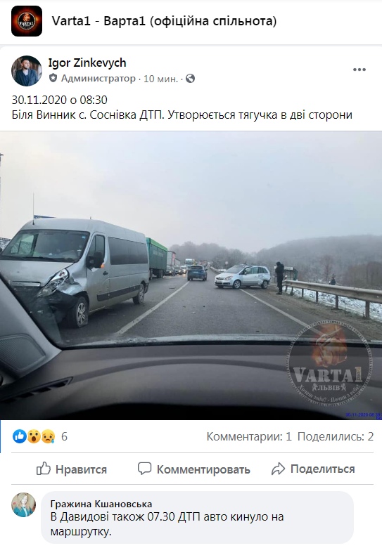«30.11.2020 о 08:30. Біля Винник с. Соснівка ДТП. Утворюється тягучка в дві сторони»,- зазначається у повідомленні, де також оприлюднено світлину з місця події.
