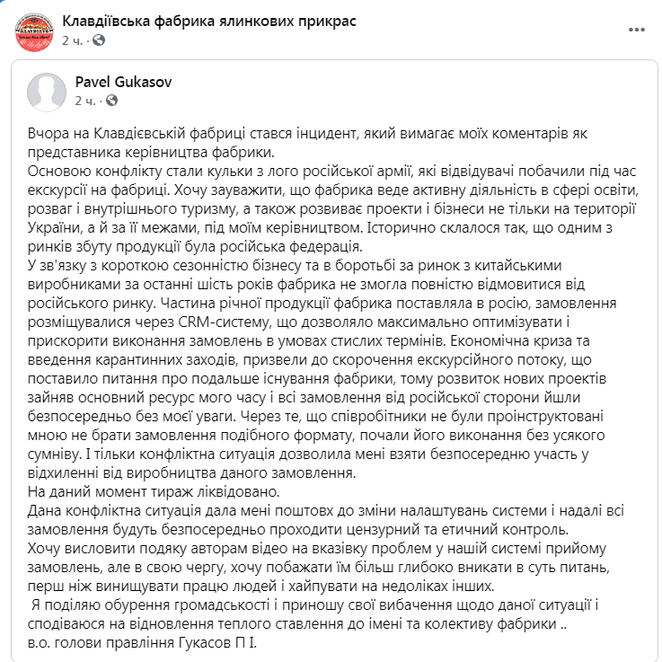 «Історично склалося так, що одним з ринків збуту продукції була російська федерація. У зв’язку з короткою сезонністю бізнесу та в боротьбі за ринок з китайськими виробниками за останні шість років фабрика не змогла повністю відмовитися від російського ринку. Частина річної продукції фабрика поставляла в Росію, замовлення розміщувалися через CRM-систему, що дозволяло максимально оптимізувати та прискорити виконання замовлень в умовах стислих термінів», – йдеться у повідомленні Павла Гукасова, який поширила у Facebook прес-служба підприємства.