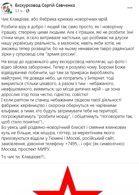 Зайшовши під час екскурсії заводу до цеху, на забороні входу в який наполягав сам екскурсовод, відвідувачі побачили цілі коробки біло-червоних прикрас. На новорічних кульках чітко проступала радянська зірка і напис: «Армия РФ».