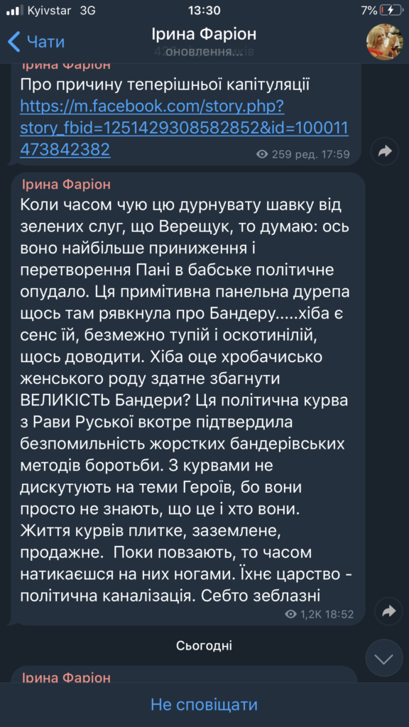 «Коли часом чую цю дурнувату шавку від зелених слуг, що Верещук, то думаю: ось воно найбільше приниження і перетворення Пані в бабське політичне опудало. Ця примітивна панельна дурепа щось там рявкнула про Бандеру…..хіба є сенс їй, безмежно тупій і оскотинілій, щось доводити. Хіба оце хробачисько женського роду здатне збагнути ВЕЛИКІСТЬ Бандери?», – написала Фаріон.