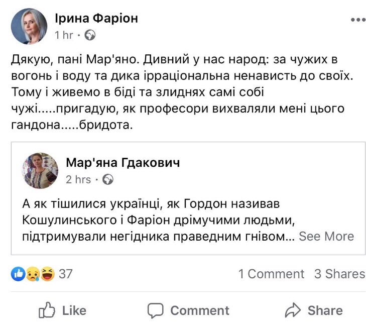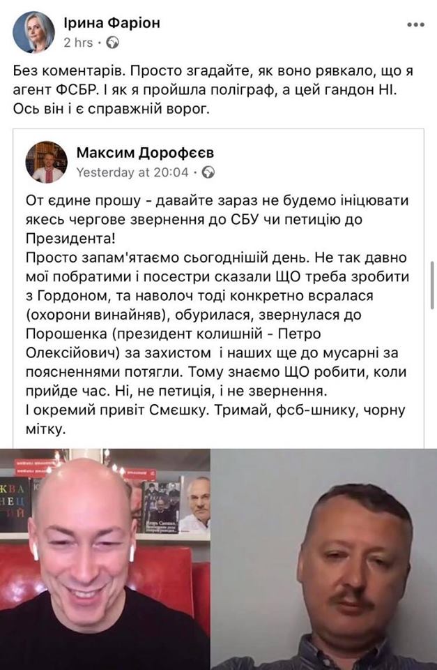 Так Фаріон відреагувала на скандальне інтерв’ю Гордона з терористом Ігорем Гіркіним на своїй сторінці у Фейсбуці, пише Четверта студія.