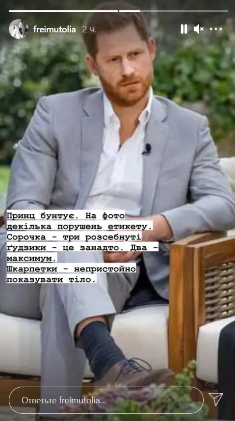 За словами знаменитості, своїм вбранням герцог порушив декілька правил етикету. Про це Фреймут повідомила на сторінці в Instagram-stories (фото можна побачити нижче).