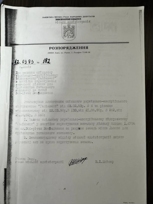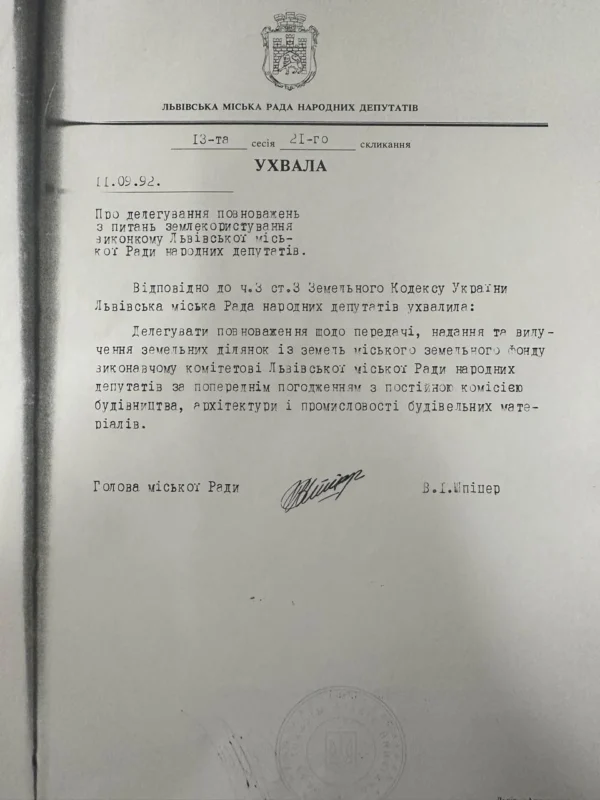 «Галінвест» повністю відкидає ці звинувачення, називаючи їх маніпулятивними. Компанія посилається на архівну ухвалу Львівської міської ради від 11 вересня 1992 року, якою виконавчому комітету делеговано повноваження щодо розпорядження земельними ділянками (відповідно до Земельного кодексу УРСР). Саме на цій підставі, за твердженням підприємства, у 1993–1994 роках видано державний акт. Ігнорування цього документа міськрадою в офіційних заявах «Галінвест» вважає свідомим спотворенням фактів.