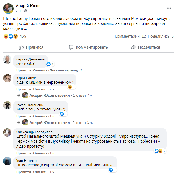 «Щойно Ганну Герман оголосили лідером штабу спротиву телеканалів Медведчука – мабуть усі інші розбіглися, лишилась тухла, але перевірена кремлівська консерва, ви ще азірова мобілізуйте…», – зазначив Андрій Юсов.