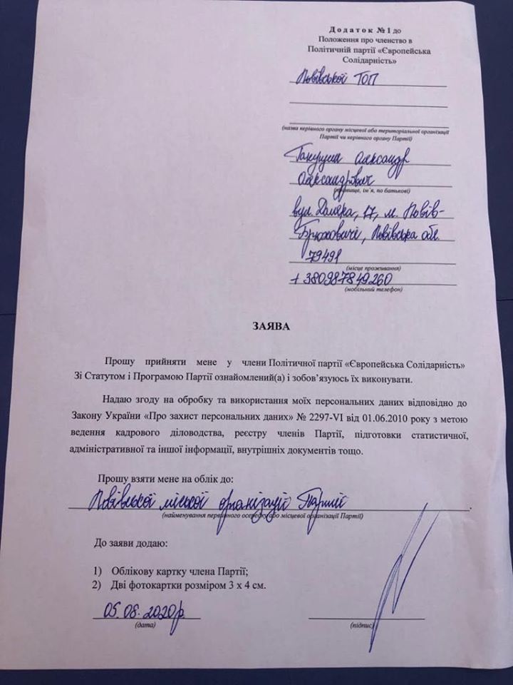 “Зробив ще один крок, щоб стати ближче до команди. Найсильнішої політичної команди на чолі з Петро Порошенко. З якою працював, працюю і маю намір продовжити робити безліч добрих справ на благо Львівщини та всієї країни. Прохання до друзів, небайдужих до долі своєї громади і нашої неньки, до всього поважного славного товариства!Приєднуйтеся до нас – до Європейська Солідарність Разом – будемо сильніші!”, – зазначається у дописі голови Львівської обласної ради Олександра Ганущина.