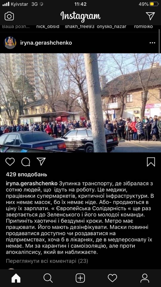 “Зупинка транспорту, де зібралась з сотня людей, що їдуть на роботу. Це медики, працівники супермаркетів, критичної інфраструктури. В них немає масок, бо їх немає ніде. Або – продаються в ціну їх зарплат.”, – йдеться у дописі.