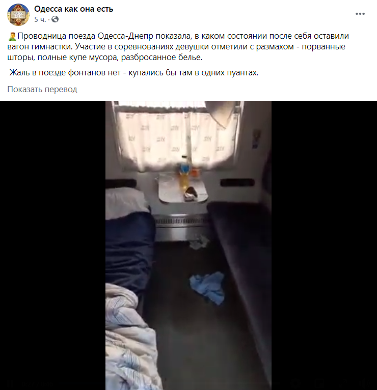 Провідниця поїзду Дніпро-Одеса показала, в якому стані після себе залишили вагон гімнастки з Одеси. Участь в змаганнях дівчата відзначили з розмахом – порвані штори, повні купе сміття, розкидана білизна.