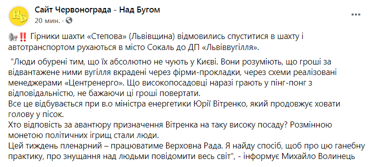 “Люди обурені тим, що їх абсолютно не чують у Києві. Вони розуміють, що гроші за відвантажене ними вугілля вкрадені через фірми-прокладки, через схеми реалізовані менеджерами «Центренерго». Що високопосадовці наразі грають у пінг-понг з відповідальністю, не бажаючи ці гроші повертати.