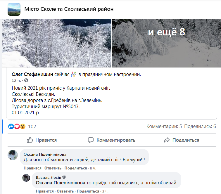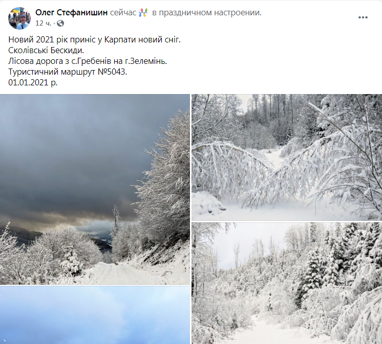 «Новий 2021 рік приніс у Карпати новий сніг. Сколівські Бескиди. Лісова дорога з с.Гребенів на г.Зелемінь. Туристичний маршрут №5043. 01.01.2021 року», – зазначає на своїй сторінці у ФБ Олег Стефанишин, який оприлюднив світлини з місця події.