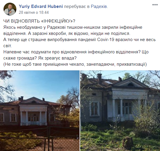 «Чи відновлять «інфекційку»? Якось необдумано у Радехові тишком-нишком закрили інфекційне відділення. А заразні хвороби, як відомо, нікуди не поділися. А тепер ще страшне випробування пандемії Covir-19 вразило чи не весь світ. Напевне час подумати про відновлення інфекційного відділення? Що скаже громада? Як зреагує влада? Не гоже, щоб таке приміщення чекало, занепадаючи, прихватизації», – зазначив у своєму дописі Yuriy Edvard Hubeni, який на сторінці спільноти «Радехів online» оприлюднив світлини колишнього приміщення інфекційної лікарні у місті Радехів.