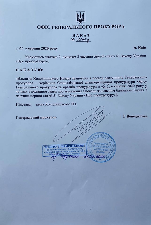 Голова Спеціалізованої антикорупційної прокуратури Назар Холодницький написав заяву на звільнення. Наказ про його звільнення підписала генпрокурор Ірина Венедіктова.