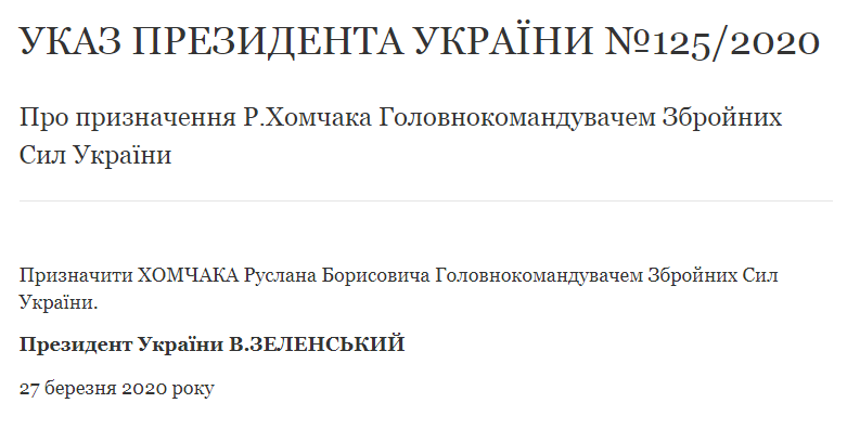 Згідно з Указом Президента України №125/2020 генерал-полковника Хомчака Руслана Борисовича призначено Головнокомандувачем Збройних Сил України.
