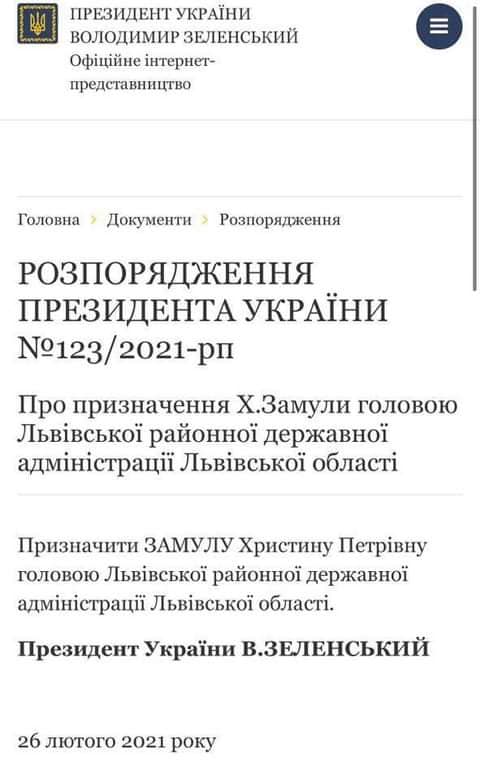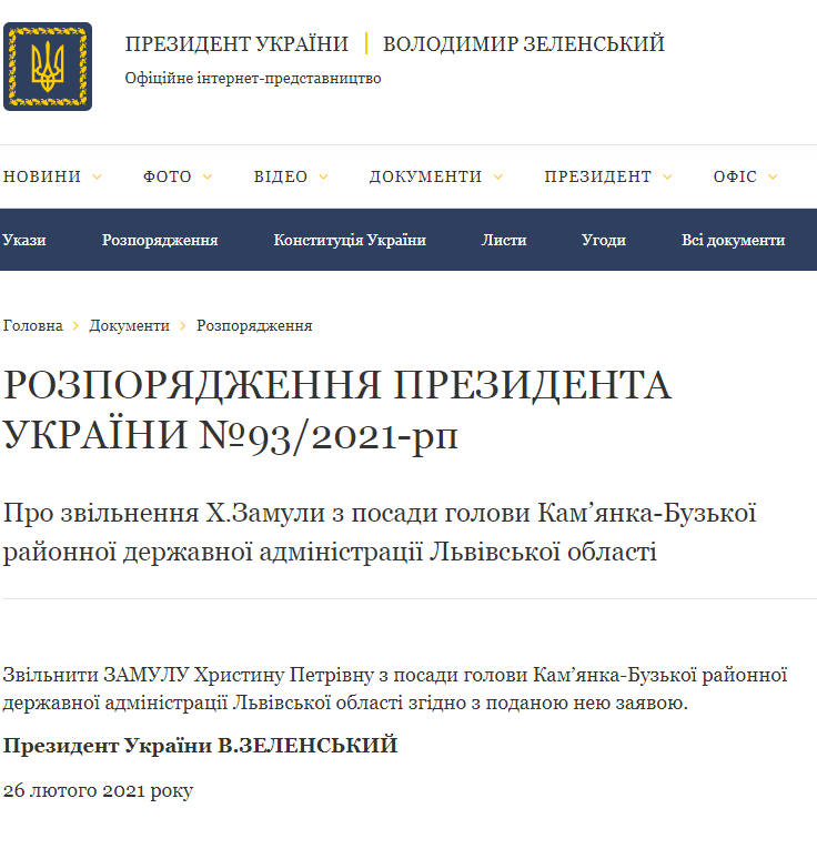 Іншим розпорядженням, Президент України звільнив Замулу Христину Петрівну з посади голови Кам’янка-Бузької районної державної адміністрації Львівської області згідно з поданою нею заявою.