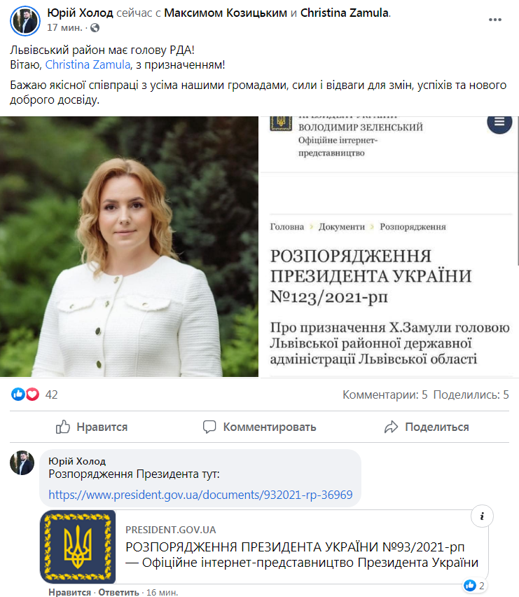 «Львівський район має голову РДА! Вітаю, Christina Zamula, з призначенням! Бажаю якісної співпраці з усіма нашими громадами, сили і відваги для змін, успіхів та нового доброго досвіду», – зазначає на своїй сторінці у ФБ Юрій Холод.