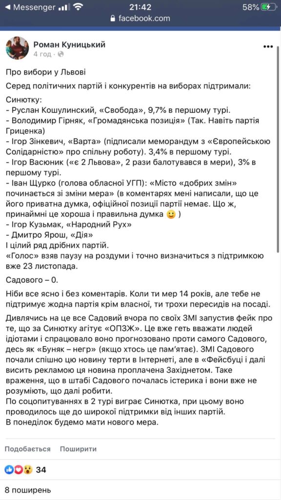 Дивлячись на це все Садовий вчора по своїх ЗМІ запустив фейк про те, що за Синютку агітує «ОПЗЖ». Це вже геть вважати людей ідіотами і спрацювало воно прогнозовано проти самого Садового, десь як «Буняк – негр» (якщо хтось це пам’ятає). ЗМІ Садового почали спішно цю новину терти в Інтернеті, але в «Фейсбуці і далі висить рекламою ця новина проплачена “Західнетом”. Таке враження, що в штабі Садового почалась істерика і вони вже не розуміють, що далі робити.