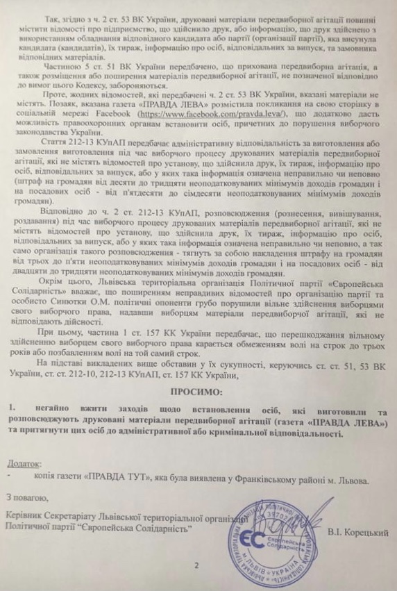 В документі йдеться про виявлену 30 жовтня агітаційну продукцію, газету “Правда Лева”, яка розповсюджувалась у Франківському районі Львова з грубими порушеннями норм виборчого законодавства України, а також з порушенням прав та інтересів організації партії та кандидата на посаду Львівського міського голови Олега Синютки, висунутого Львівською територіальною організацією партії “Європейська Солідарність”.