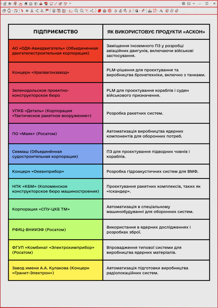 На той момент компанія вже була залучена до оборонно-промислового комплексу Росії, який у значних масштабах виробляв зброю для війни проти України. Ось перелік конкретних прикладів роботи АТ «АСКОН» у цій сфері: