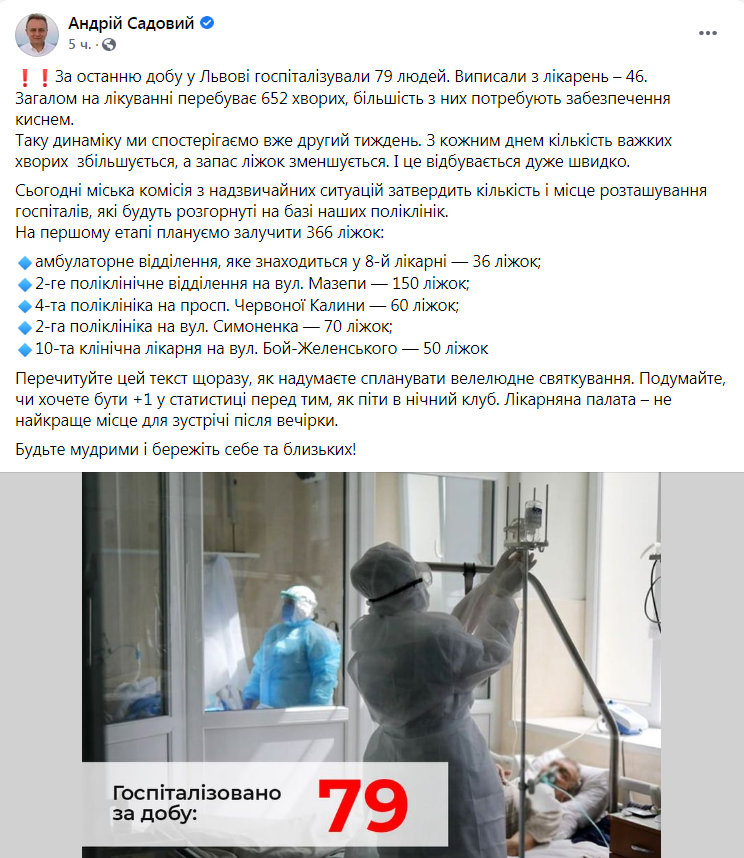 ❗️❗️За останню добу у Львові госпіталізували 79 людей. Виписали з лікарень – 46.