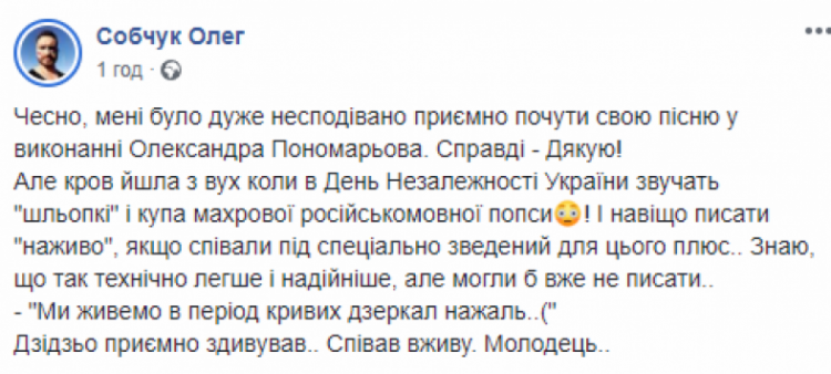Фронтмен гурту “СКАЙ” Олег Собчук, пісню якого “Тебе це може вбити” заспівав Олександр Пономарьов, написав на фейсбуці, що свою пісню почути був радий, а от від “російськомовної попси” ледь кров з вух не пішла.