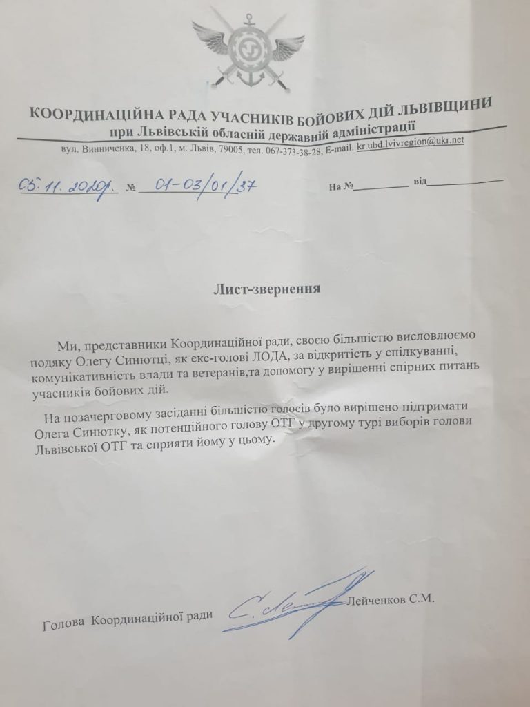 “Ми, представники Координаційної ради, своєю більшістю висловлюємо подяку Олегу Синютці, як екс-голові ЛОДА, за відкритість у спілкуванні, комунікативність влади та ветеранів, та допомогу у вирішенні спірних питань учасників бойових дій”, – зазначив у зверненні Голова Координаційної ради Сергій Лейченков