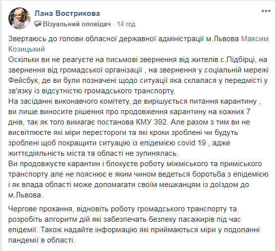 “Звертаюсь до голови обласної державної адміністрації м.Львова Максим Козицький. Оскільки ви не реагуєте на письмові звернення від жителів с.Підбірці, на звернення від громадської організації , на звернення у соціальній мережі Фейсбук, де ви були позначені щодо ситуації яка склалася у передмісті у зв’язку із відсутністю громадського транспорту.