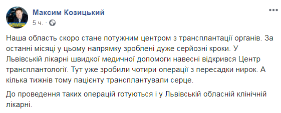 “За останні місяці у цьому напрямку зроблені дуже серйозні кроки. У Львівській лікарні швидкої медичної допомоги навесні відкрився Центр трансплантології. Тут уже зробили чотири операції з пересадки нирок. А кілька тижнів тому пацієнту трансплантували серце. До проведення таких операцій готуються і у Львівській обласній клінічній лікарні”, – написав Козицький.