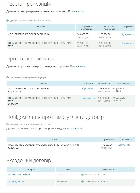 Аукціон стартував 6 травня, на нього подалися ФОП Перетятько Ольга Валеріївна та ТзОВ “Дизарт груп”, які запрпоонували 129 500 грн і 130 000 грн відповідно. Переможцем обрали ТзОВ “Дизарт груп”, після відмови Ольги Перетятько, яка повідомила, що не може вчасно виконати замовлення.