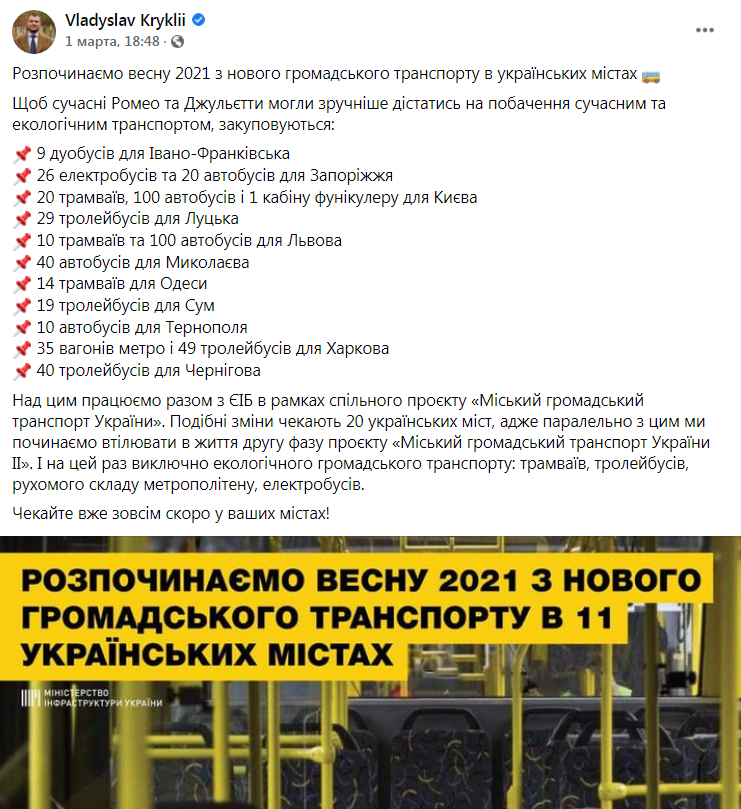 «Над цим працюємо разом з ЄІБ в рамках спільного проєкту «Міський громадський транспорт України». Подібні зміни чекають 20 українських міст, адже паралельно з цим ми починаємо втілювати в життя другу фазу проєкту «Міський громадський транспорт України ІІ». І на цей раз виключно екологічного громадського транспорту: трамваїв, тролейбусів, рухомого складу метрополітену, електробусів. Чекайте вже зовсім скоро у ваших містах!»,- написав Криклій.