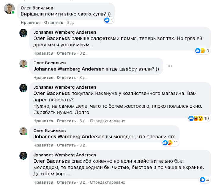 Данець Йоганнес Андерсен, який подорожував потягом “Укрзалізниці”, вирішив самостійно очистити забруднене вікно у своєму вагоні.