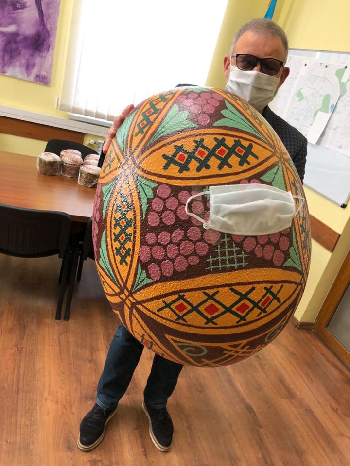 Міський голова Винник Володим Квурт передасть громаді Глинян велику писанку, яку виготовили винниківські умільці.