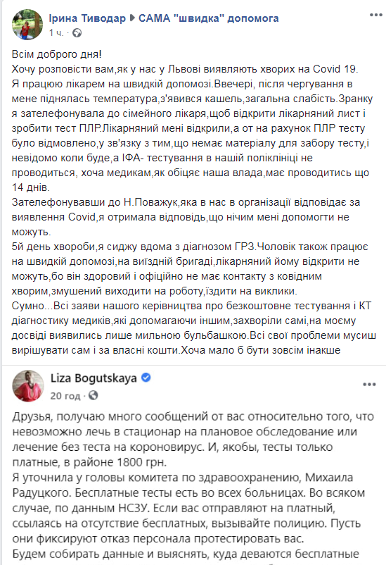 «Хочу розповісти вам, як у нас у Львові виявляють хворих на Covid 19. Я працюю лікарем на швидкій допомозі. Ввечері, після чергування в мене піднялась температура, з’явився кашель, загальна слабість. Зранку я зателефонувала до сімейного лікаря, щоб відкрити лікарняний лист і зробити тест ПЛР. Лікарняний мені відкрили, а от на рахунок ПЛР-тесту було відмовлено, у зв’язку з тим, що немає матеріалу для забору тесту, і невідомо коли буде, а ІФА- тестування в нашій поліклініці не проводиться, хоча медикам, як обіцяє наша влада,має проводитись що 14 днів.