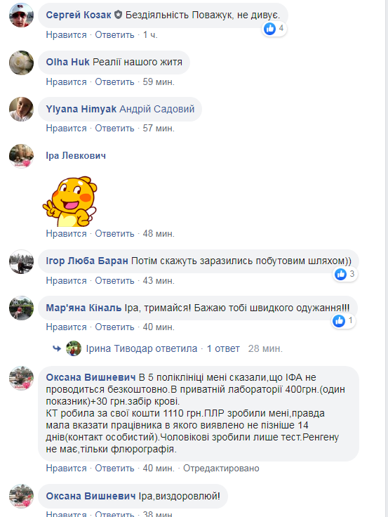 Сумно…Всі заяви нашого керівництва про безкоштовне тестування і КТ діагностику медиків, які допомагаючи іншим, захворіли самі, на моєму досвіді виявились лише мильною бульбашкою. Всі свої проблеми мусиш вирішувати сам і за власні кошти. Хоча мало б бути зовсім інакше», – зазначає у своєму дописі лікар Ірина Тиводар.