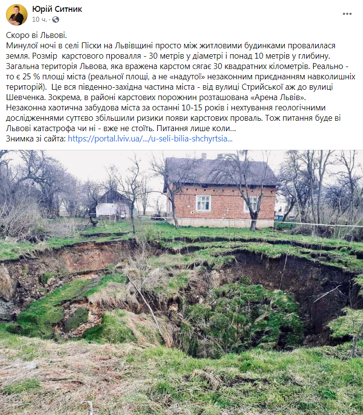 «Скоро ві Львові. Минулої ночі в селі Піски на Львівщині просто між житловими будинками провалилася земля. Розмір карстового провалля – 30 метрів у діаметрі і понад 10 метрів у глибину.