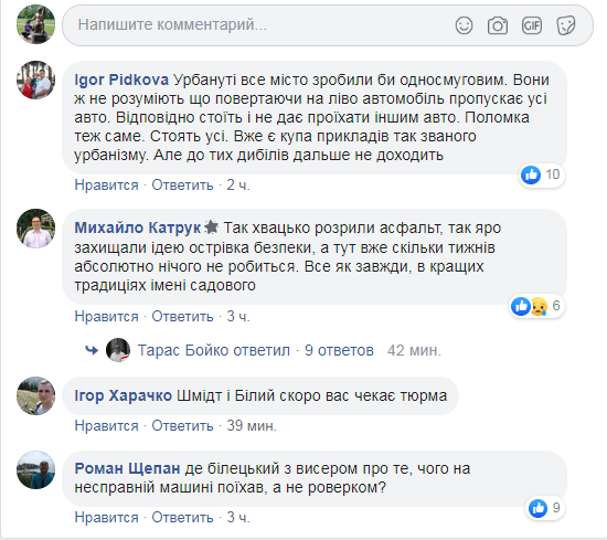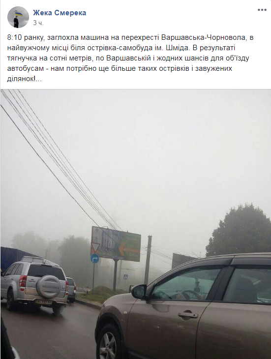 “8:10 ранку, заглохла машина на перехресті Варшавська-Чорновола, в найвужчому місці біля острівка-самобуда ім. Шміда. В результаті тягнучка на сотні метрів, по Варшавській і жодних шансів для об’їзду автобусам – нам потрібно ще більше таких острівків і завужених ділянок!“, – написав 2 вересня на сторінці спільноти “Львів без заторів” Жека Смерека.