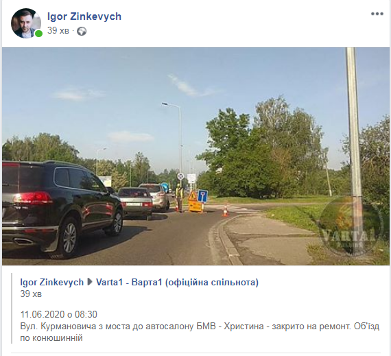 Також Ігор Зінкевич повідомляє про те, що “11.06.2020 о 08:30, вул. Курмановича з моста до автосалону БМВ – Христина – закрито на ремонт. Об’їзд по Конюшинній”.