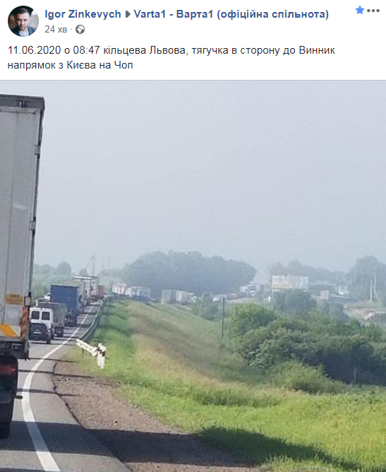 Як пише “Четверта студія”, на сторінці ГО “Варта 1” у ФБ Ігор Зінкевич інформує, що “11 червня о 08:47 на кільцевій дорозі Львова – тягучка в сторону до Винник напрямок з Києва на Чоп”.