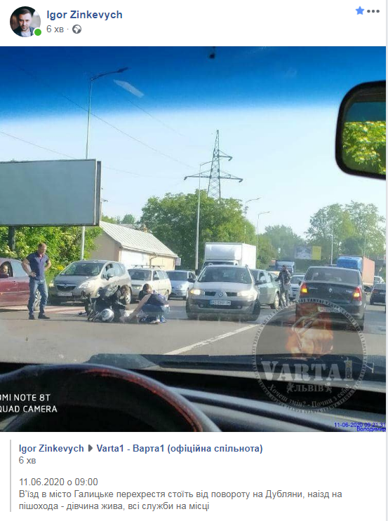 Як повідомляє “Варта 1” у ФБ, “11.06.2020 о 09:00, в’їзд в місто Галицьке перехрестя стоїть від повороту на Дубляни, наізд на пішохода – дівчина жива, всі служби на місці”.