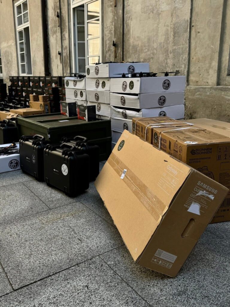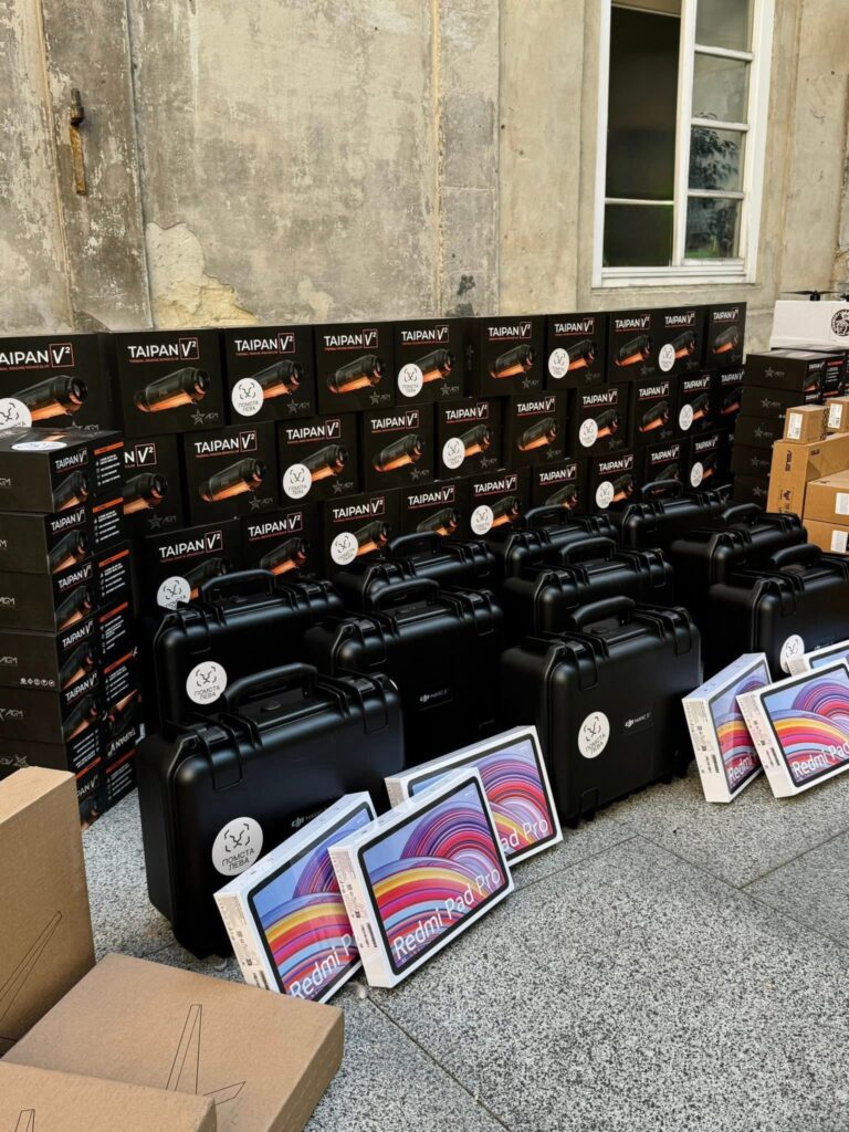 FPV-окуляри, зарядні станції, наземна станція керування, монітори, генератори, Starlink-и, планшети та інше спорядження.