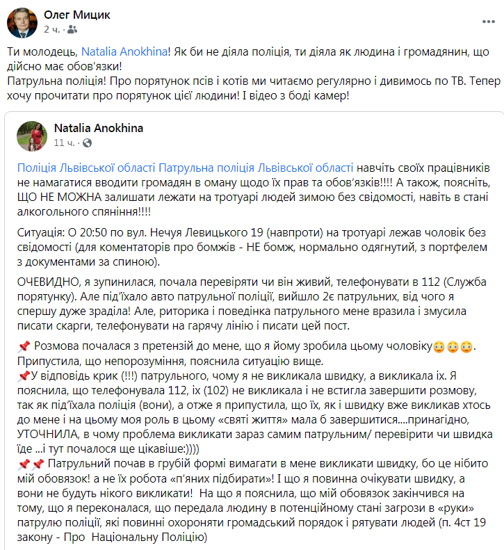 - Далі витяг рукавички і почав вимагати в мене одягти рукавички і піднімати цього громадянина/надавати йому допомогу, бо це «мій громадянський обов’язок» в грубій формі! Його напарниця в цей час стояла розгублено….Я звісно пояснила вже дуже чітко цьому «патрульному», що він попутав в цьому житті орієнтири і я, як адвокат, чітко розумію межі своєї відповідальності і їх повноважень і така поведінка переходить всі межі адекватності! І нехай чекає скаргу, за таке хамство і спробу ввести мене в оману, щодо моїх прав і обов’язків! А якщо спробує не викликати швидку і залишити людину зимою на землі! дістане заяву про вчинення злочину! Напарниця запевнила, що вони нададуть йому допомогу і я пішла, з обіцянкою все ж не дати цьому хамству просто так залишитися без уваги.