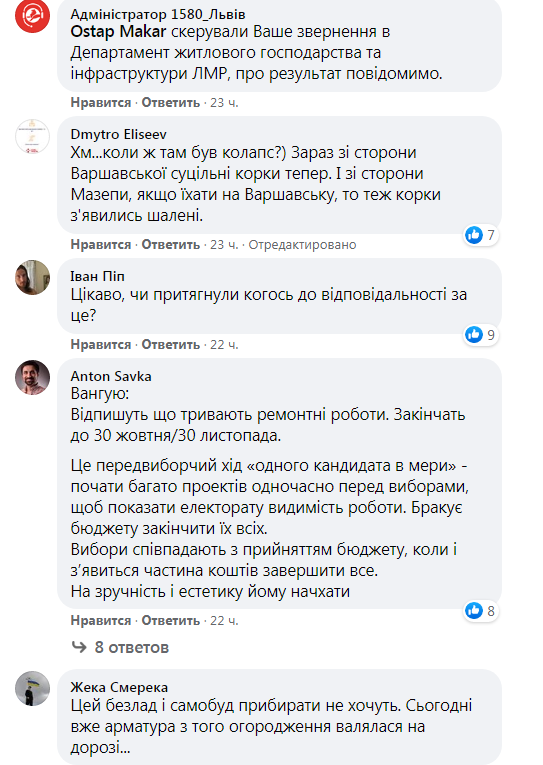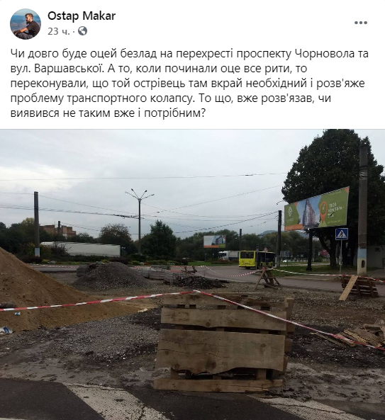 «Чи довго буде оцей безлад на перехресті проспекту Чорновола та вул. Варшавської. А то, коли починали оце все рити, то переконували, що той острівець там вкрай необхідний і розв’яже проблему транспортного колапсу. То що, вже розв’язав, чи виявився не таким вже і потрібним?», – зазначається у зверненні Ostap Makar на «Гарячу лінію міста Львова» у ФБ, де оприлюднено світлини з місця події.
