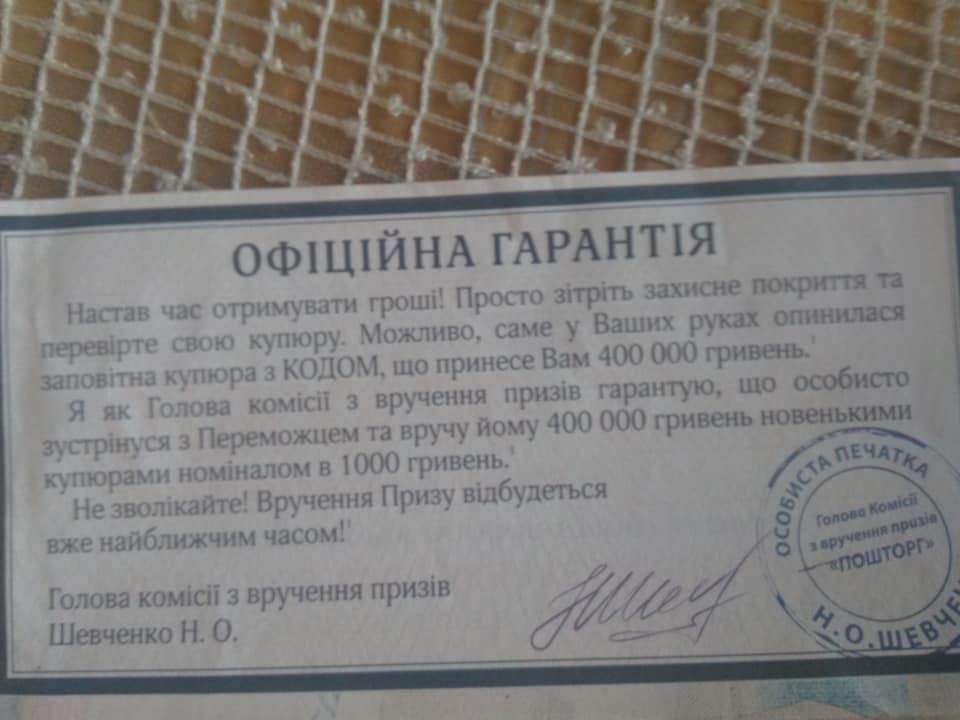У Львові городяни почали отримувати у поштові скриньки роздруковані в кольорі листи, в яких щасливчику пропонується стати учасником акції «Щаслива купюра» і отримати шанс отримати великий виграш.