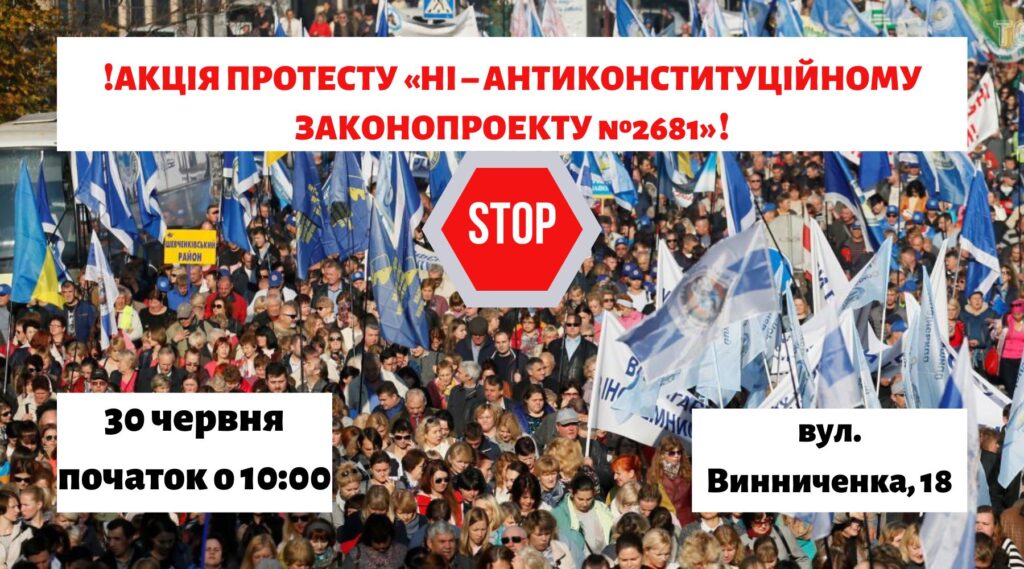 «Влада запроваджує тотальний контроль працівників та профспілок. Ініціатора законопроекту №2681 Г. Третьякову – у відставку», – наголошується у повідомленні організаторів акції.