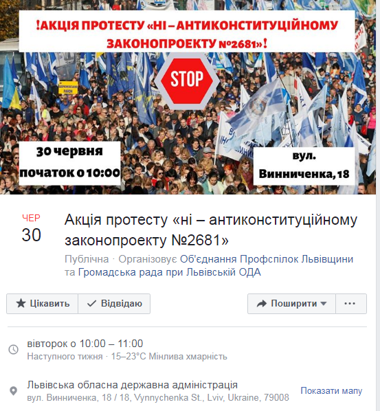 У вівторок, 30 червня, під стінами Львівської облдержадміністрації відбудеться протест трьохсот тисячного Об’єднання Профспілок Львівщини, разом з Об’єднанням роботодавців Львівщини та Громадською радою при ЛОДА, щодо недопущення прийняття законодавчих ініціатив, які порушують права громадян і профспілок.