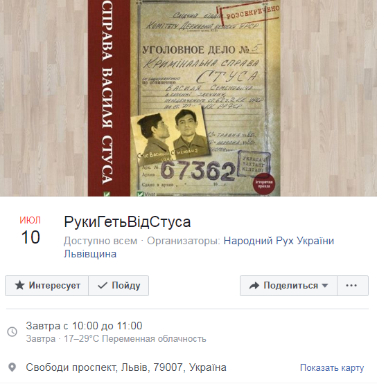 «Я не визнавав і не визнаю себе винним. До самої смерті я буду стояти на обороні правди від брехні, чистих людей від убивць, Ісуса Христа від диявола» Такими були останні слова Василя Стуса, що прозвучали 1 жовтня 1980 року під час судилища над поетом. Через 5 років його не стало, але Медведчуку й досі страшно, і через 35 років він знову хоче знищити Стуса, цього разу — у формі книги «Справа Василя Стуса», що вийшла друком у Видавництві Vivat. У п’ятницю о 10:00 в Дарницькому районному суді Києва відбудеться засідання за позовом Віктора Медведчука проти журналіста, історика, Вахтанга Кіпіані та Видавництва Vivat”, – повідомляють організатори.