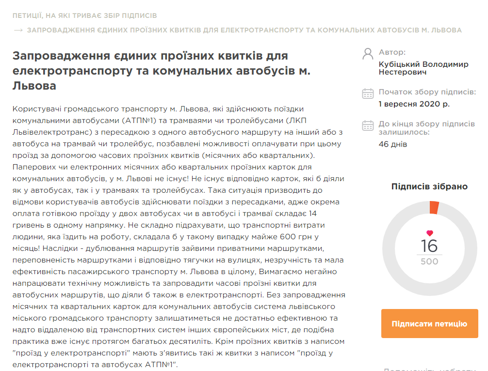 Позначки: єдиний проїзний квиток, петиція, транспорт