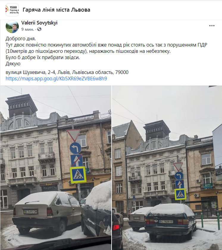 «Тут двоє повністю покинутих автомобілі вже понад рік стоять ось так з порушенням ПДР (10 метрів до пішохідного переходу), наражають пішоходів на небезпеку. Було б добре їх прибрати звідси. Вулиця Шухевича, 2-4, Львів», – зазначає у зверненні на «Гарячу лінію міста Львова» Valerii Sovytskyi, який оприлюднив світлини з місця події.